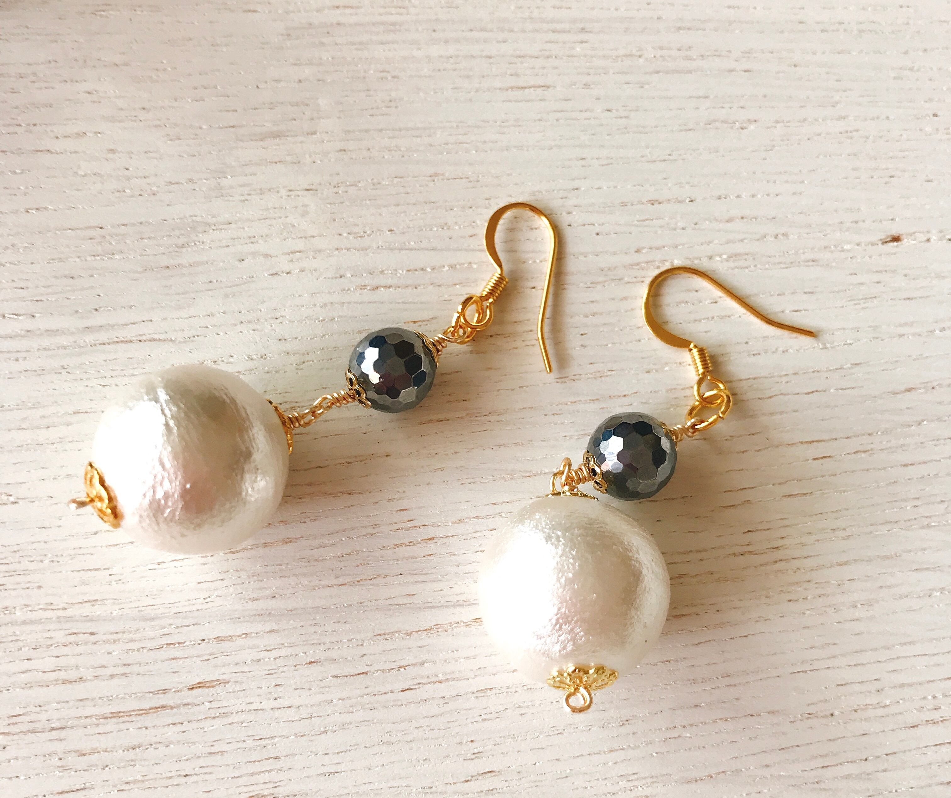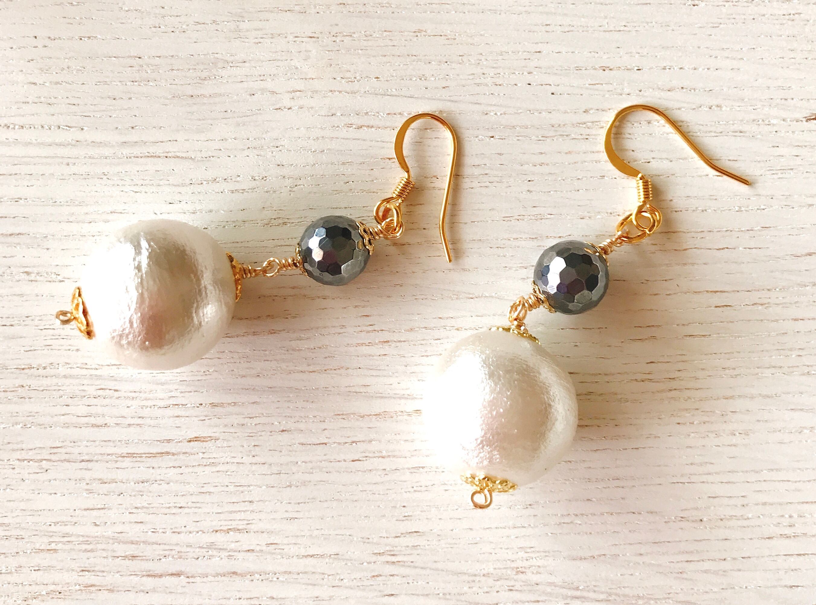 キラキラテラヘルツと大きめコットンパールのイヤリング