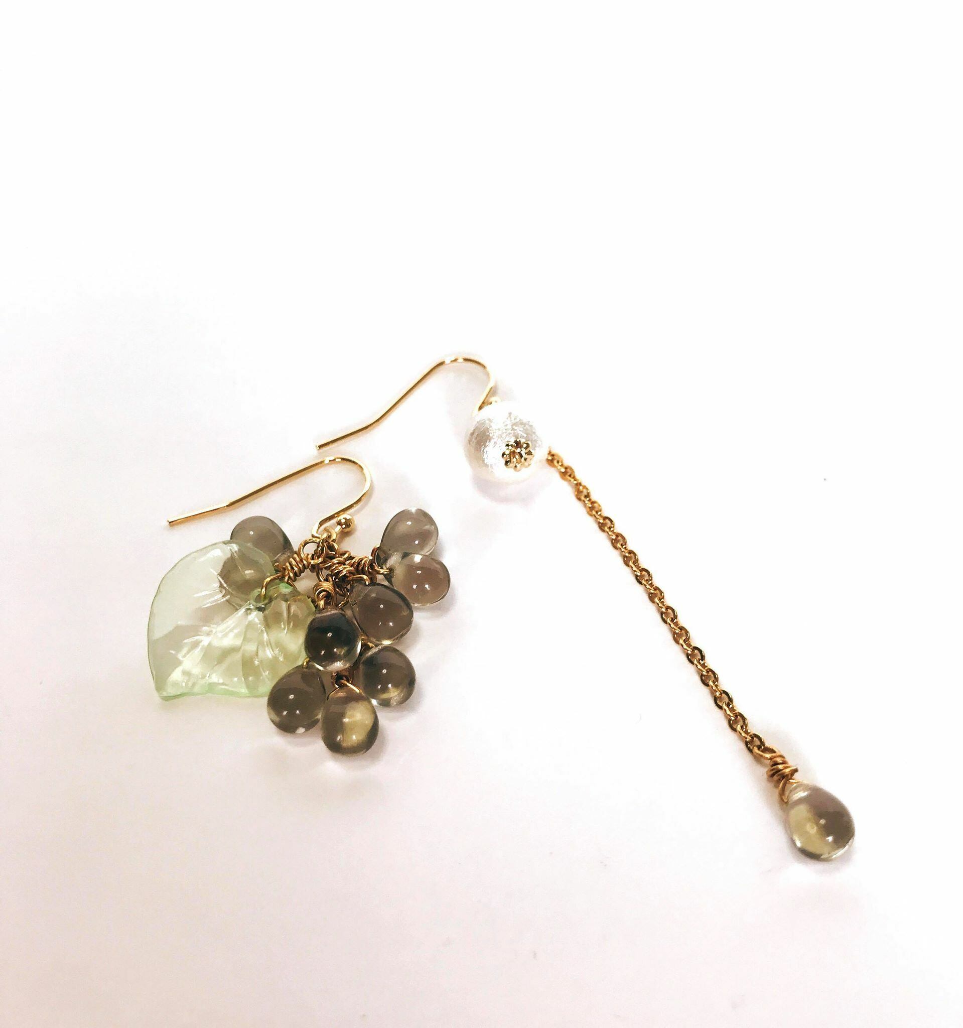 片方は、ドロップビーズを房にしたものに、ブドウの葉っぱを思わせるパーツを添えて実り豊かなイメージに。