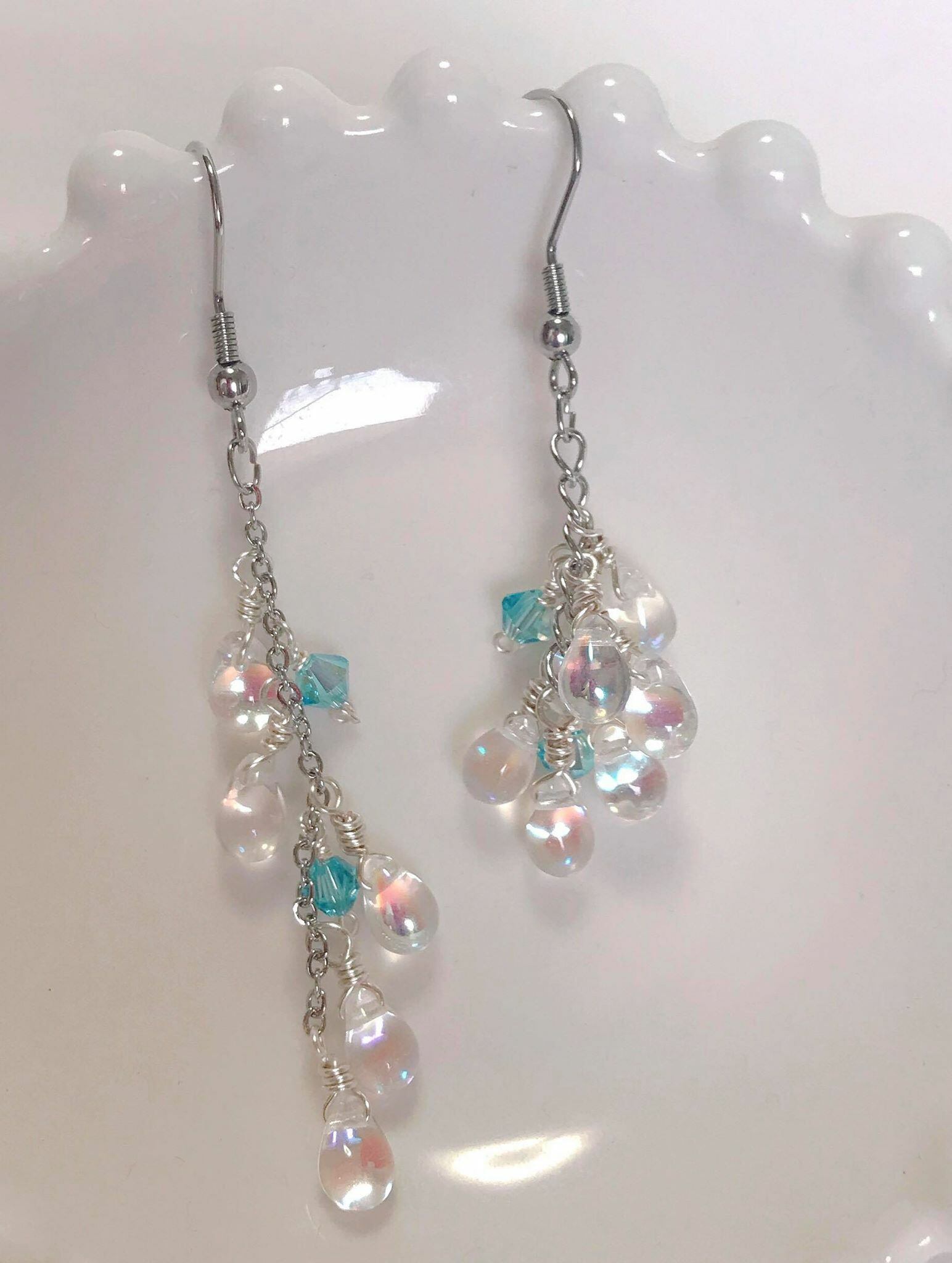 涼やかなオーロラクリアのドロップビーズと、アクアブルーのスワロフスキービーズをつなげた
