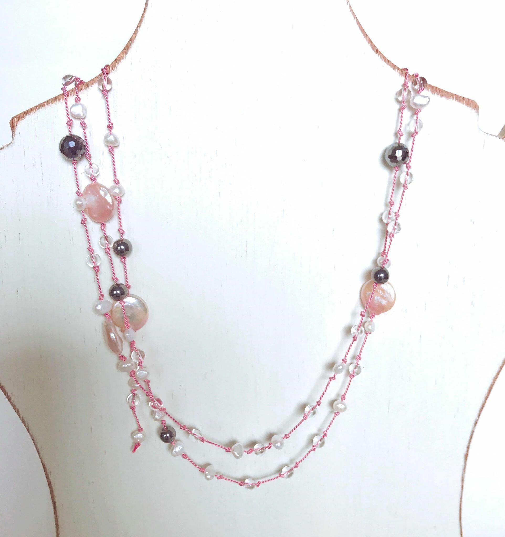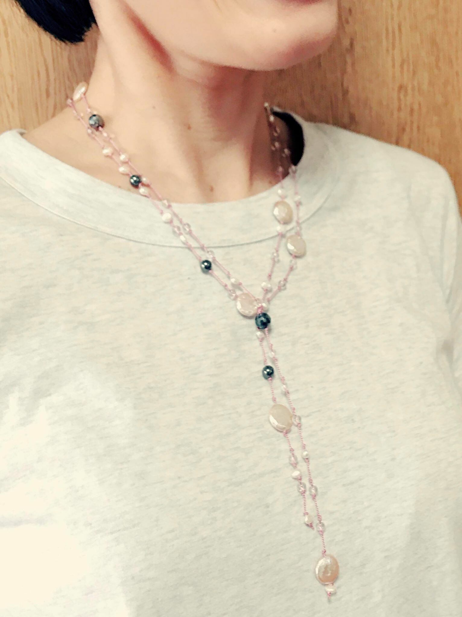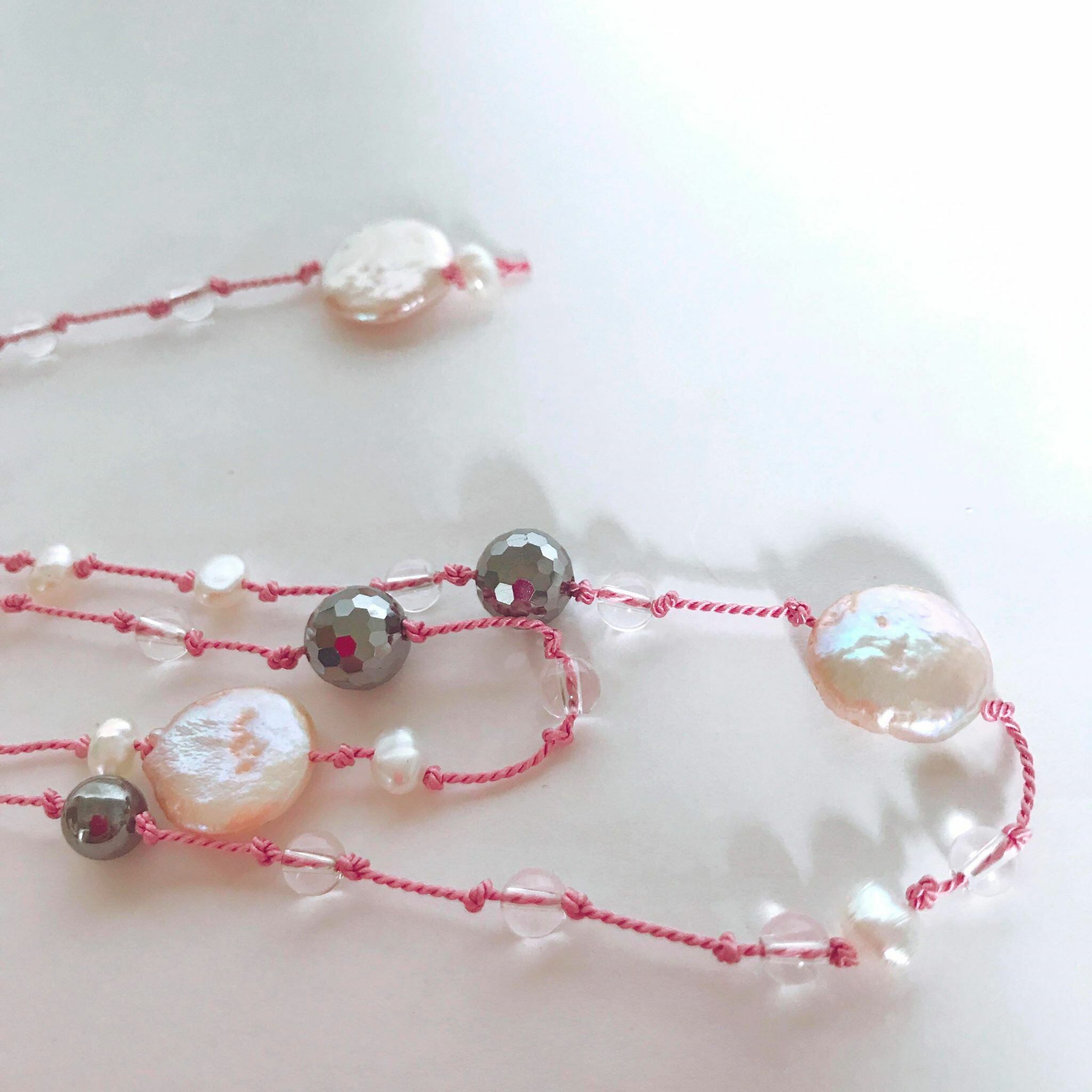 ひとつずつ、手作業で、結びながらピンクのコードに通しました!