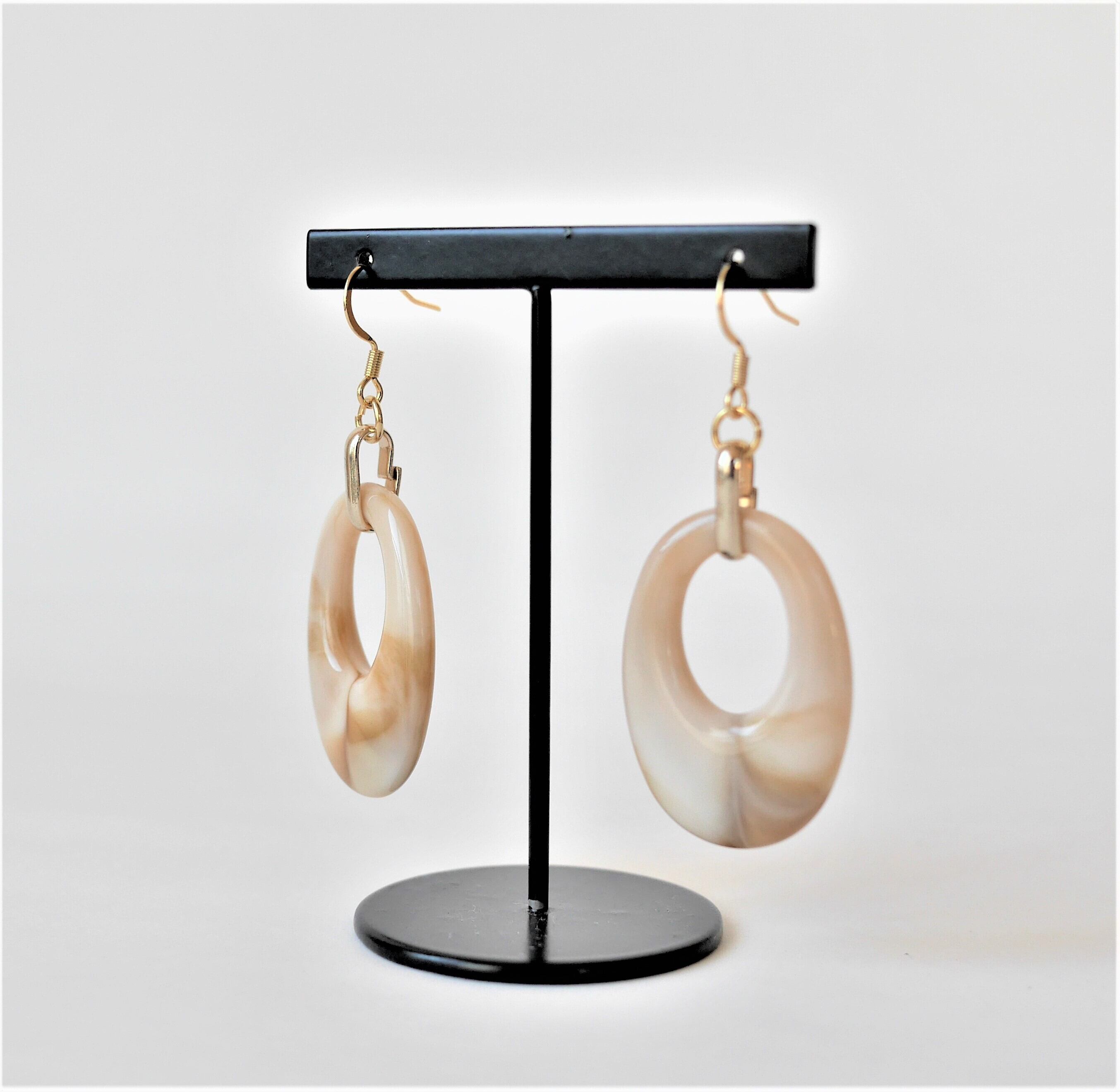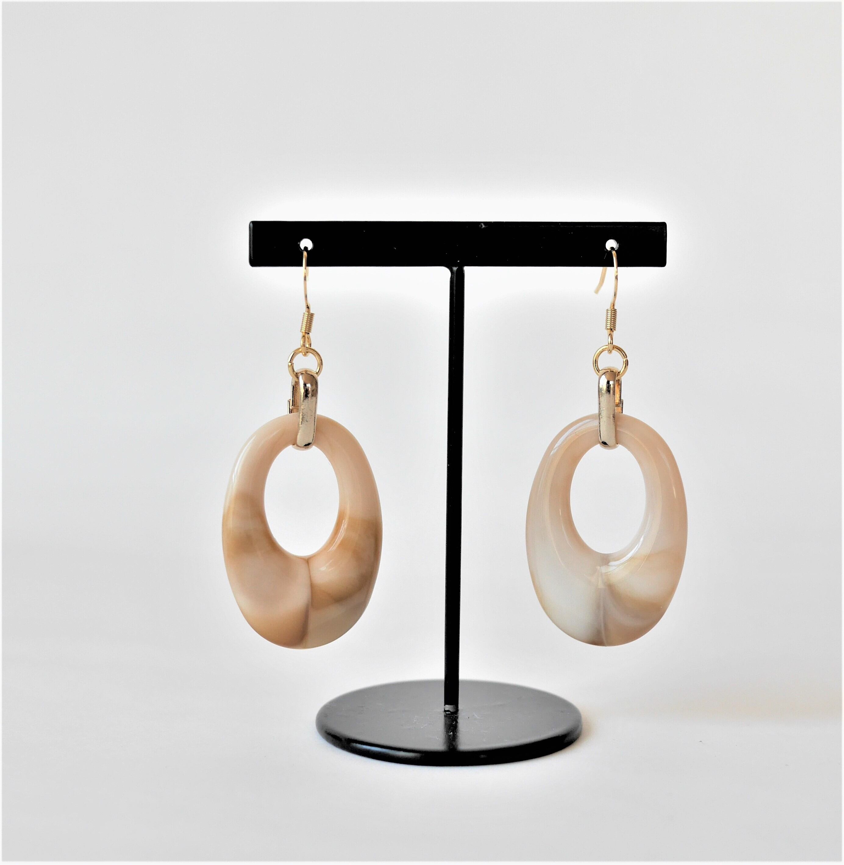 マーブル模様と上品な光沢が美しい、大ぶりなピアスはどんなコーディネートにもぴったりです。べっ甲を思わせるお色味がエレガントさを引き立ててくれます。