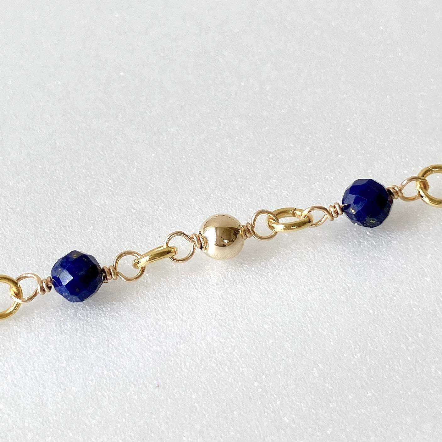 ラピスラズリと最も相性のいいのはなんといってもゴールドの輝き。今回は、K14イエローゴールドのラウンドビーズを合わせました。